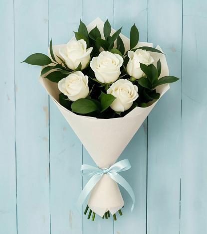 Белые розы -всегда олицетворение чего-то невесомого, парящего, воздушного, как детские мечты. Букет из белых роз будет прекрасным подарком любой женщине и девушке, который не будет нести за собой никакого скрытого смысла, а только ваше уважение, благодарность и чистые помыслы. А чтобы сделать композицию более интересной, флористы добавили к розам зелень.